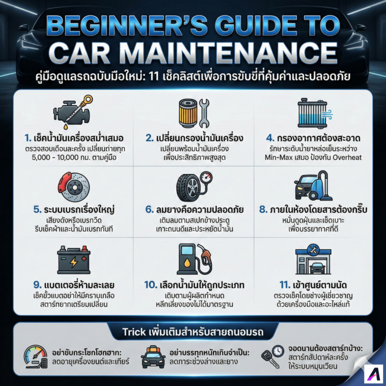 การมีรถสักคันถือเป็นการลงทุนครั้งใหญ่ และวิธีที่จะทำให้การลงทุนนี้คุ้มค่าที่สุดก็คือ “การบำรุงรักษา” เพราะรถที่ได้รับการดูแลดี นอกจากจะขับขี่ปลอดภัยและนุ่มนวลแล้ว เวลาจะขายต่อก็ได้ราคาดีกว่ารถที่ปล่อยปละละเลย มาดู 11 เช็คลิสต์ที่มือใหม่ต้องทำกัน