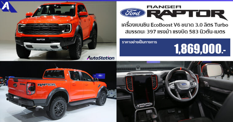 Ford ประเทศไทยเปิดตัว All New Ford Ranger Raptor 2022 รถกระบะออฟโรดสมรรถนะสูงอย่างเป็นทางในประเทศไทย มีให้เลือกเฉพาะขุมพลังเบนซิน V6 3.0 Twin-Turbo 397 แรงม้า (ส่วนขุมพลังดีเซลจะตามออกมาภายหลัง) เปิดราคาจำหน่ายอย่างเป็นทางการในประเทศไทยที่ 1,869,000 บาท