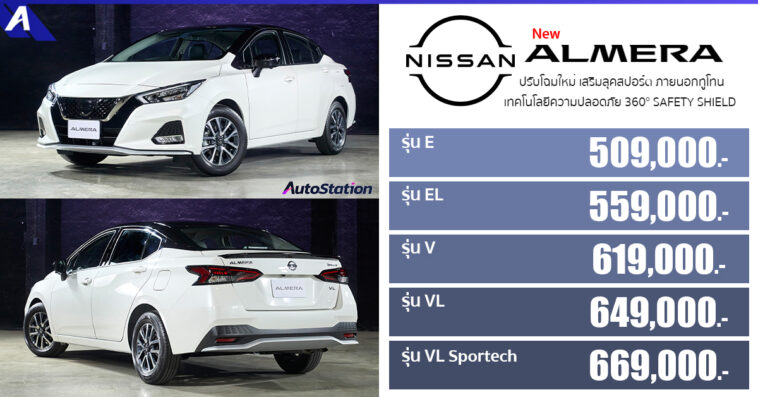 เปิดตัว Nissan Almera ใหม่ เสริมความสปอร์ต พรีเมียม ด้วยดีไซน์ภายนอกสปอร์ตเข้มด้วยสีทูโทน ตกแต่งวัสดุสีดำเงา ภายในห้องโดยสารที่คงความกว้างขวาง มาพร้อมเบาะนั่งพรีเมียม QUOLE MODURE ตอบสนองทุกไลฟ์สไตล์ พร้อมอุปกรณ์อำนวยความสะดวก และเทคโนโลยีความปลอดภัยขั้นสูง 360° SAFETY SHIELD รอบคัน