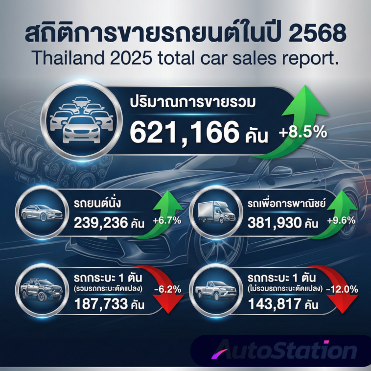 สรุปภาพรวมตลาดรถยนต์ในประเทศไทยประจำปี 2568 ออกมาเป็นที่เรียบร้อย! แม้จะมีปัจจัยท้าทายหลายด้าน แต่ตัวเลขโดยรวมถือว่าทำให้ใจชื้นขึ้นมาได้บ้าง โดยมียอดขายรวมทั้งสิ้นอยู่ที่ 621,166 คัน เติบโตขึ้นจากปีก่อนถึง +8.5% สะท้อนให้เห็นถึงกำลังซื้อที่เริ่มกลับมาฟื้นตัวอย่างต่อเนื่อง