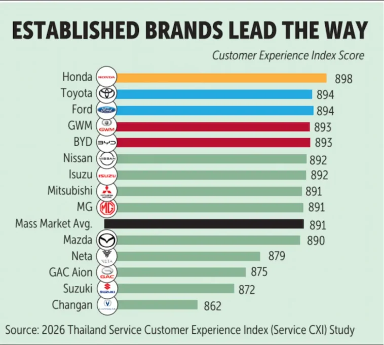สมรภูมิใหม่ แข่งกันที่บริการหลังการขาย สมรภูมิตลาดรถยนต์ในไทยตอนนี้ไม่ได้แข่งกันแค่ที่โชว์รูมอีกต่อไป แต่ลามไปถึง “ศูนย์บริการ” อ้างอิงจากรายงาน 2026 Thailand Service Customer Experience Index (Service CXI) Study ที่จัดทำโดย Differential ซึ่งสำรวจความคิดเห็นจากเจ้าของรถ 2,651 ราย ระบุว่าคะแนนความพึงพอใจเฉลี่ยของอุตสาหกรรมรถยนต์แมสแบรนด์ลดลง 2 คะแนน มาอยู่ที่ 891 คะแนน จากเต็ม 1,000 คะแนน ซึ่งสะท้อนให้เห็นถึงช่องว่างระหว่างสิ่งที่แบรนด์สัญญาไว้กับสิ่งที่ลูกค้าได้รับจริง