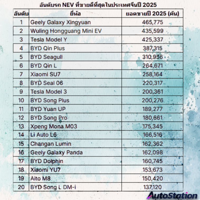 รถ NEV ที่ขายดีที่สุดในประเทศจีนในปี 2025 20 อันดับแรก